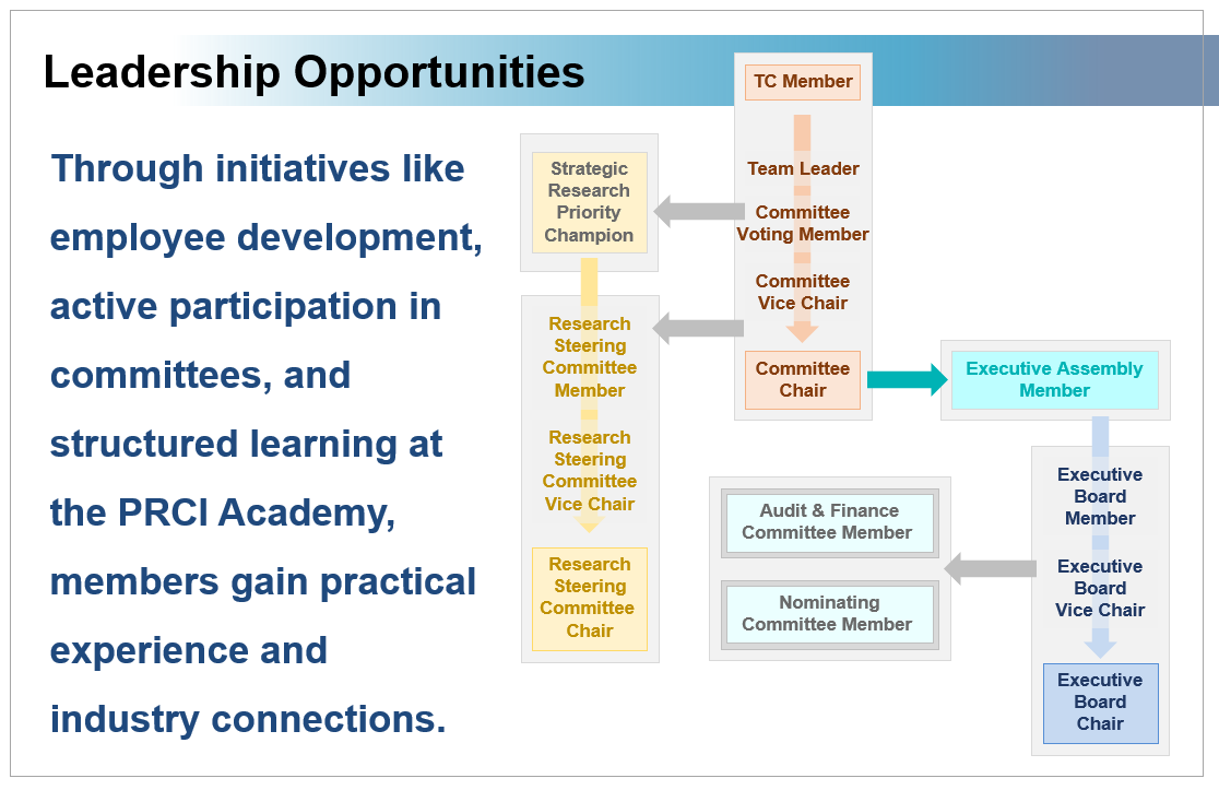 PRCI provides clear pathways for leadership roles, including project leadership and executive positions, allowing members to influence policy and governance. PRCI’s standing committees facilitate diverse opportunities for involvement, promoting research excellence, and strategic thinking.